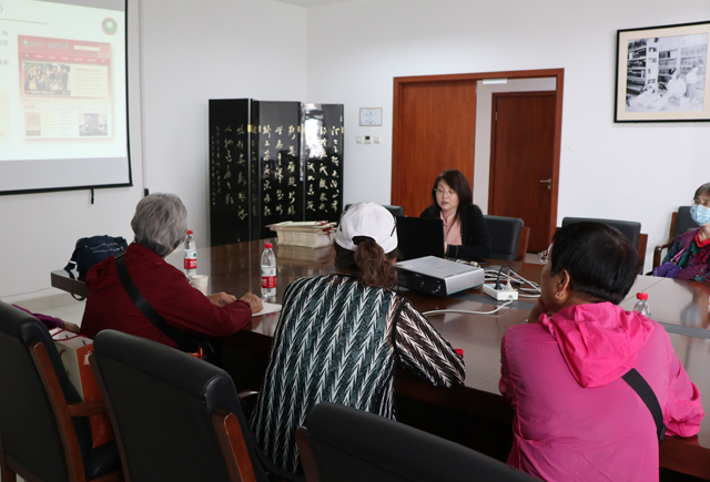 退休老同志在年輕館員的帶領(lǐng)下,參觀了徐特立圖書館馨書房、馨書吧、軍事閱覽室、老院長徐特立紀(jì)念展、黨建工作室等特色區(qū)域,了解圖書館的設(shè)計、使用、功能布局等情況,觀看了自助借還書機(jī)、圖書殺菌機(jī)等現(xiàn)代先進(jìn)設(shè)備的使用演示。隨后,姚文莉副館長主持兩支部交流座談會,就圖書館現(xiàn)在的基本情況、資源與服務(wù)、未來五/十年建設(shè)規(guī)劃等情況向老同志做了介紹。