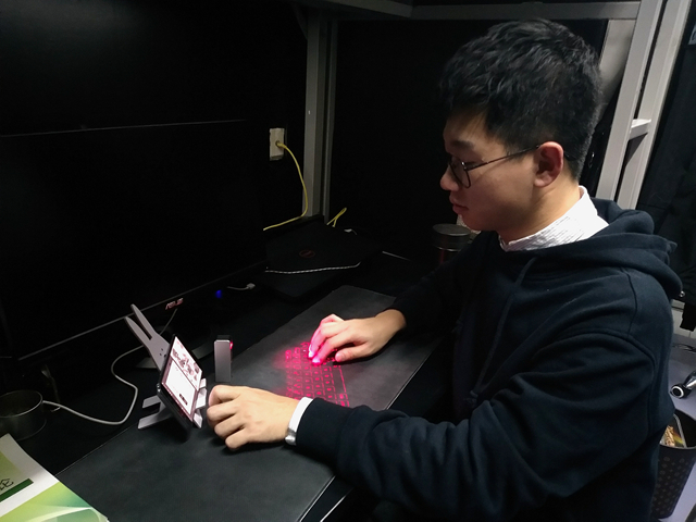 宿舍的宋善臺正在座位上修改論文,由于論文需要在15:30之前交,宋善臺特意從外邊趕回來,做最后的修改。記者走近一看,他沒有開電腦,而是用手指在桌子上敲打文字。原來,他使用了“投影鍵盤”,打開這個工具,桌子上就會投出一個像鍵盤一樣的影子,在桌子的鍵盤上打字,通過藍牙,打好的字就可以顯示在手機屏幕上,文章修改完直接通過手機發到老師郵箱。“著急的時候就不用再等待電腦開機了。”宋善臺說,如果早晨交論文的話,還可以把鍵盤“投”在床桌上,這樣“不出被窩也能提交,基本上桌子就可以代替電腦?!?/p>