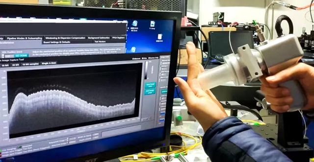 手持掃描手柄,在自己的手指上輕輕滑動,眼前的電腦屏幕中,隨即呈現出清晰的手指皮膚二維、三維斷層圖像……,這是學生使用國內領先的光學相干層析(OCT)技術教學儀器開展學習的場景。