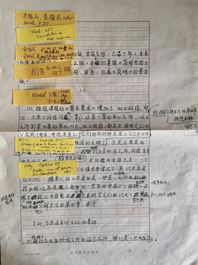 改革開放前夕,國內的相關教材都是源自蘇聯,李瀚蓀在系統研究分析之后,發現這些教材在體系劃分、內容編排上,并不適用于我國弱電類人才培養的需求,由此他把研究重點又轉向歐美國家出版的教材。一本本厚厚的外文原著,李瀚蓀不知翻閱了多少遍。在透徹研究了國外相關人才培養的論述和教學資料后,李瀚蓀開始提筆編寫中國第一部高校《電路分析基礎》課程教材。沒有電腦、沒有打字機,李瀚蓀編寫教材只有一支筆和一摞稿紙。