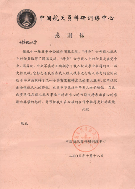 【圖】中國航天員科研訓練中心給我校發來感謝信
