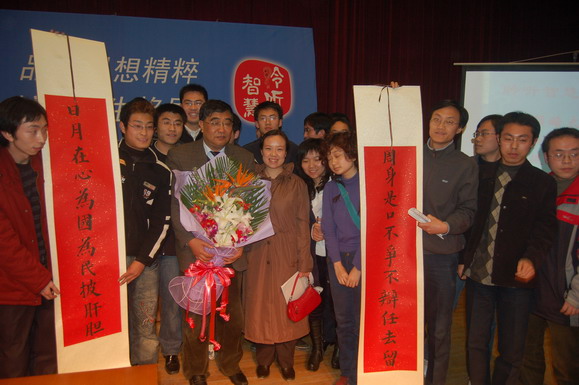 在北京理工大學學習的山西學子得知呂主席要來我校演講的消息后,在老鄉間相互轉告,并派代表早早的到來會場支持他們心目中的好領導。他們在會場打出了“呂主席,北理工山西學子歡迎您”的橫幅,并在講座開始前,選派代表為呂主席獻上了鮮花和他們事先準備好的禮物——一幅為呂主席書寫的對聯。上聯是“日月在心為國為民披肝膽”;下聯是“周身是口不爭不辯任去留?!庇靡员磉_山西學子對呂主席的敬意。