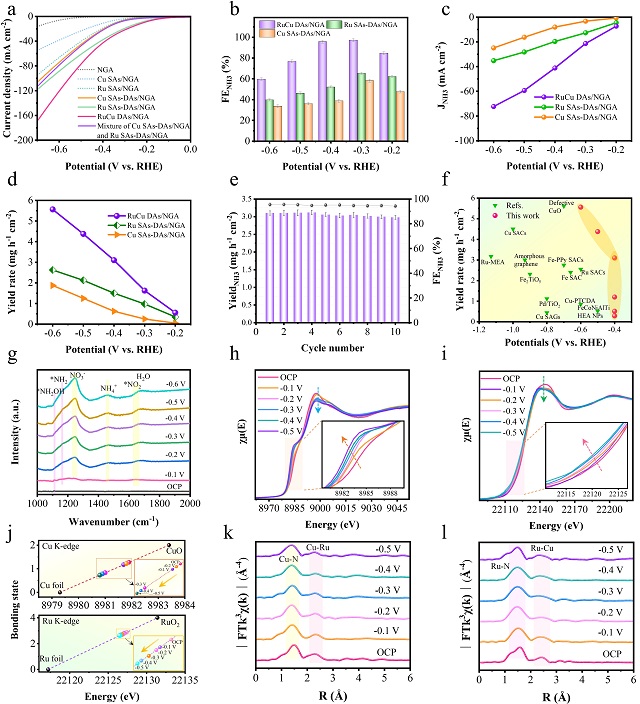 實驗表明,RuCu DAs/NGA催化劑在-0.4 V(vs. RHE)條件下,氨法拉第效率達95.7%,產率達3.1 mg h?1 cm?2,性能居同類催化劑前列。通過原位光譜表征與密度泛函理論計算,揭示了反應過程中不對稱RuN?-CuN?活性位點的動態演化機制:釕位點優先吸附硝酸鹽,銅位點調控氫物種吸附,協同降低*NO→*NHO等關鍵步驟的能壘,從而提升合成氨效率。