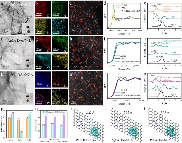電化學硝酸鹽還原反應(NO3RR)可將水中硝酸鹽污染物轉化為氨,兼具環境治理與清潔能源生產雙重價值。然而,傳統催化劑受限于活性位點密度低、反應路徑復雜等問題,難以實現高選擇性與高穩定性。原子級分散雙原子催化劑(DACs)因其獨特的電子結構和協同效應備受關注,但其精準合成與機制仍是較大難題。研究團隊提出脈沖放電合成策略,將百微秒級高密度電流作用于負載氮摻雜石墨烯氣凝膠(NGA)的釕、銅鹽納米晶前驅體,兩種金屬鹽納米晶體在瞬時高溫下發生“微爆”分解,釕、銅原子錨定于NGA的納米孔缺陷位點,形成不對稱RuN?-CuN?配位結構。該方法突破傳統熱解法合成限制,單次放電僅需數百微秒級時間,有望用于雙原子催化劑的規模化制備。