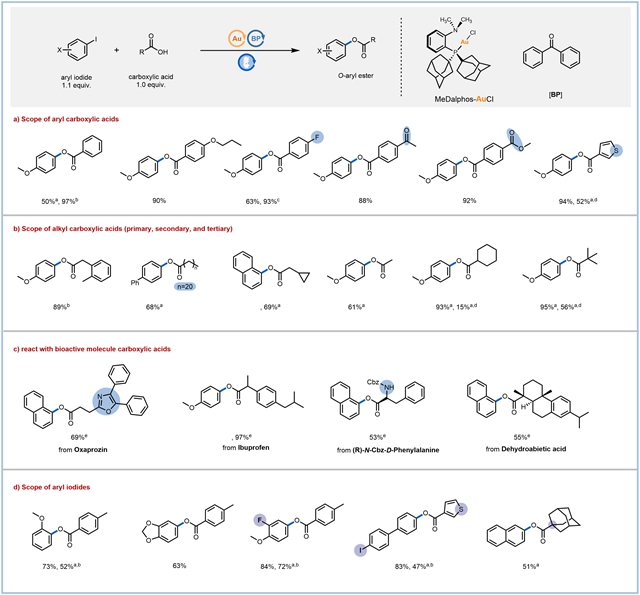 近年來,配體促進的 Au(I)/Au(III)催化與反應性較低的芳基碘化物的交叉偶聯反應(如 C-C、C-N、C-S/Se 和 C-O(醇))被廣泛研究(圖 1a)。由于采用了雙齒配體,Au(I) 與 Ar-I 的氧化加成步驟可以在低溫條件下快速完成,最近的化學反應和計算也證明了這一點。盡管取得了這些進展,但通過金催化與羧酸形成 C-O 鍵的嘗試仍未取得成功。事實上,這一挑戰源于關鍵的還原消除步驟必須通過 Au(III) 羧酸鹽中間體,而這在熱力學上是不利的。 為了解決這一挑戰,近日北京理工大學材料學院楊榮杰/夏中華團隊首次報道了光誘導的金催化下實現的芳基/烷基羧酸與芳基碘化物之間的酯化反應(圖 1b)。利用二苯甲酮作為廉價而有效的光敏劑和(P, N)配體金催化劑,通過光敏化能量轉移促進了這種轉化,生成了三重態芳基-金(III)-羧酸鹽中間體。這種酯化方法對各種官能團都有很好的耐受性,而且對各種芳基和烷基(1o、2o、3o)羧酸都有很高的產率。這種光誘導金催化能量轉移的策略已被應用于其他幾種光敏化金催化反應中。
