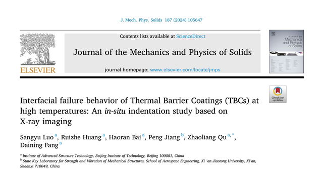 [1] S. Luo, R. Huang, H. Bai, P. Jiang, Z. Qu, D. Fang, Interfacial failure behavior of Thermal Barrier Coatings (TBCs) at high temperatures: An in-situ indentation study based on X-ray imaging, Journal of the Mechanics and Physics of Solids 187 (2024) 105647. https://doi.org/10.1016/j.jmps.2024.105647.