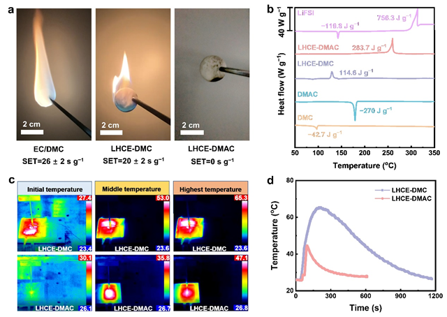 LHCE-DMAC的自熄滅時間為0 s g?1,這說明LHCE-DMAC是不燃的(圖1)。DSC測試表明LHCE-DMC在130℃出現放熱峰(114.6 J g?1),而LHCE-DMAC在260℃出現放熱峰(283.7 J g?1),這說明LHCE-DMAC具有高的熱穩定性。紅外圖像顯示,LHCE-DMAC電池的最高溫度可達47.1oC,遠低于LHCE-DMC電池的溫度(65.3 oC)。