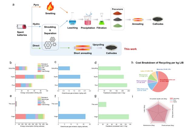 圖6 (a) 不同回收LIBs正極的流程;(b) 不同方法每回收1kg廢舊電池的能耗;(c) 不同方法每回收1kg廢舊電池的溫室氣體排放;(d) 不同方法每回收1kg廢舊電池的原料處理成本;(e) 使用原始材料和回收材料制造1kg正極的能耗;(f) 使用原始材料和回收材料制造1kg正極的溫室氣體排放;(g) 使用原始材料和回收材料制造1kg正極的原料處理成本;(h) Upcycling技術(shù)每公斤鋰電池回收成本的細(xì)分;(i) 不同方法回收成本細(xì)分的綜合對(duì)比。