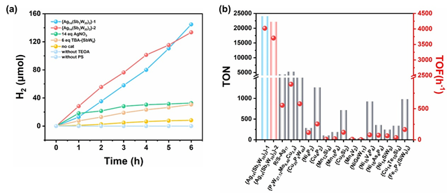 此外,作者發(fā)現(xiàn)得益于碗狀{Sb3W30}配體和Ag活性位點的高效協(xié)同催化作用, {Ag14(Sb3W30)2}-1和{Ag14(Sb3W30)2}-2均表現(xiàn)出優(yōu)異的光催化產(chǎn)氫性能,兩例團簇光催化6小時的產(chǎn)氫TON分別高達24117和22233。