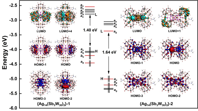 DFT理論計算表明,{Ag14(Sb3W30)2}-1可被視為含有Jahn-Teller畸變的4電子(1S21P2)超原子構(gòu)型,而{Ag14(Sb3W30)2}-2則具有4電子(1sg21su2)超分子構(gòu)型,該電子結(jié)構(gòu)的差異賦予了兩例團簇迥異的的光熱轉(zhuǎn)換和光致發(fā)光性能。