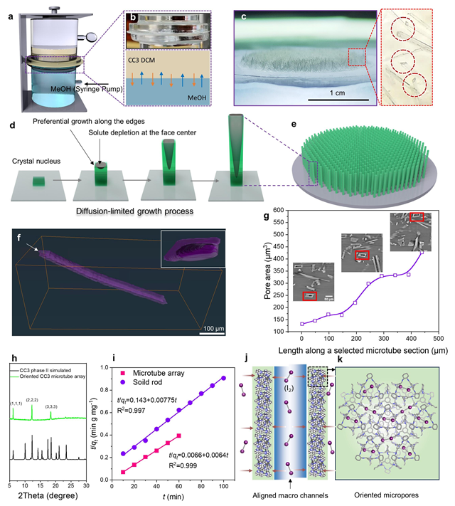 在前期研究的基礎上,課題組以典型有機分子籠CC3為研究對象,提出了一種基于物理與化學作用的多尺度協同控制自組裝策略。該策略結合分子尺度的分子堆積調控與介觀尺度流場的定向傳質,成功實現了孔道取向與定向多級次生長,一步構建出單晶級有機分子籠微管及其陣列結構。