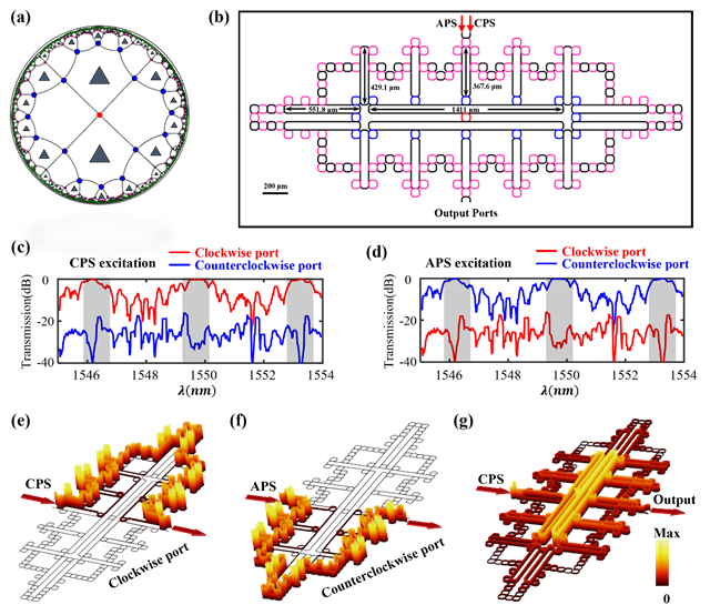 首先,研究人員考慮了龐加萊圓盤上的{6,4}面心雙曲拓撲晶格模型,如圖1a-1c所示。通過引入最近鄰、次近鄰和次次近鄰格點間的復數耦合(一半原包內),可以破壞系統的時間反演對稱性,從而引入非平庸的拓撲性質。圖1d和1e分別顯示了兩種耦合相位下的能譜和實空間陳數計算結果,其中能譜格點的顏色表征相應特征態的邊緣局域化強度。可以看出,在零能附近存在具有非平庸陳數的雙曲邊界態。隨后,研究人員通過設計環形諧振腔的空間排布和耦合,理論構造了對應于{6,4}雙曲拓撲晶格模型的片上光學結構,如圖1f所示。圖1g為雙曲拓撲光學結構的局部放大示意圖。進一步,研究人員利用有限元方法,對所設計的雙曲拓撲光學結構進行全波模擬。圖1h和1i分別顯示了順時針贗自旋(CPS)和逆時針贗自旋(APS)激發下,對應于相反傳播方向輸出端口的透射譜計算結果。計算結果顯示,在拓撲邊界態的頻率范圍內,CPS和 APS分別在相反傳播方向的出射端口展現高透射率。而在平庸邊界態和體態對應的頻率范圍內,展現較低透射率。圖1j和1k顯示了拓撲頻率激發下CPS和 APS的穩態場分布結果。圖1l為平庸體態頻率激發的場分布結果。計算結果表明,在拓撲態頻率范圍激發下,輸入光信號可以展現贗自旋選擇特性的拓撲邊緣傳導特性。