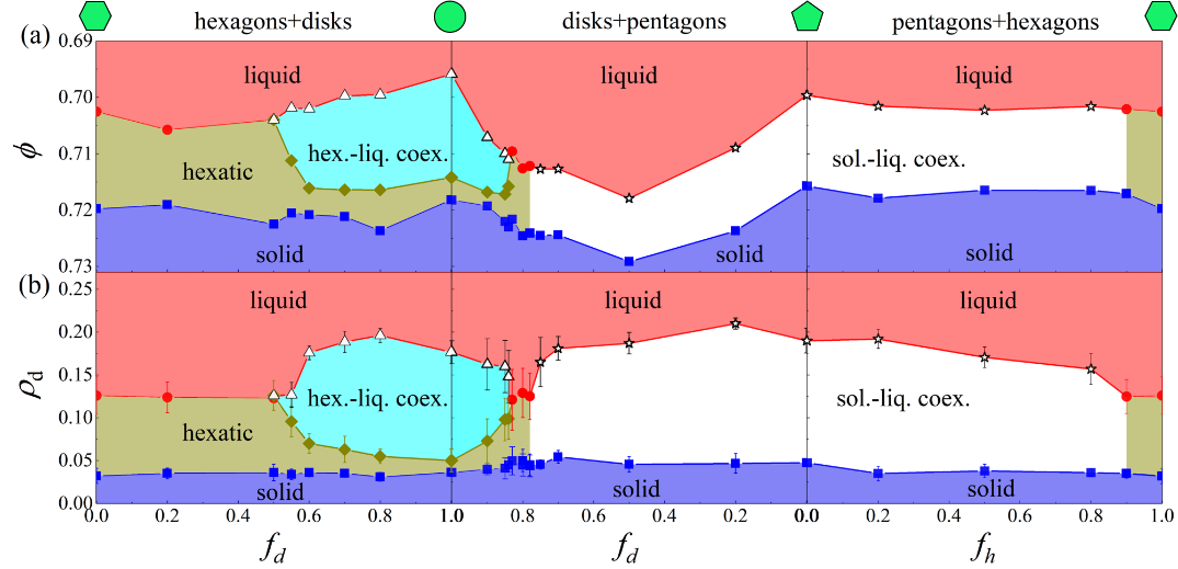 圍繞以上科學問題,團隊設計了同一尺寸的圓形,正六邊形,正五邊形的二組分及三組分混合體系,基于分子動力學模擬研究了不同配比下體系的相行為及缺陷演化。由于尺寸的均一性,不同形狀粒子的混合是均勻的(圖1),沒有出現相分離或玻璃化轉變的過程。