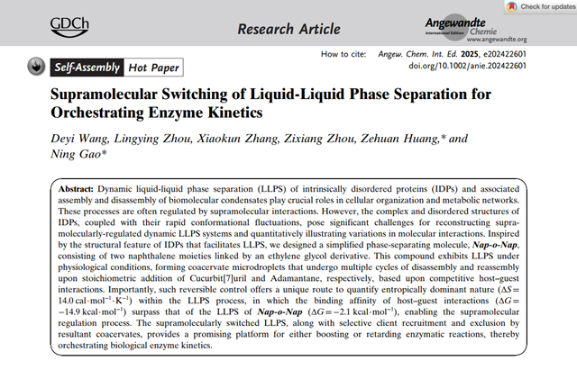 相關論文發表于 Angew. Chem. Int. Ed. ,并被選為Hot Paper。論文第一作者是北京理工大學23級碩士研究生王德儀,通訊作者是北京大學的黃澤寰研究員和北京理工大學的高寧教授。