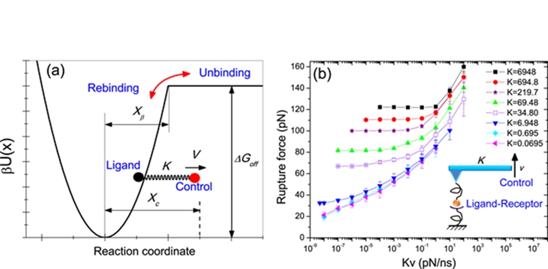 北京理工大學(xué)宇航學(xué)院生物力學(xué)與生物材料實(shí)驗(yàn)室李德昌博士和季葆華教授通過研究發(fā)現(xiàn),經(jīng)典的理論模型預(yù)測(cè)單分子鍵的強(qiáng)度隨著加載速率下降而下降的原因是沒有考慮分子鍵發(fā)生斷裂(Unbinding)后可能再次重新形成(Rebinding)的物理機(jī)理。在加載速率比較高的情況下,單分子鍵在斷裂后重新形成的幾率比較小,因此忽略該過程是可以接受的。但是,隨著加載速率的下降,單分子鍵重新形成的概率逐漸增加。因此,單分子鍵在超低加載速率情況下,其斷裂行為偏離了經(jīng)典的理論模型。
