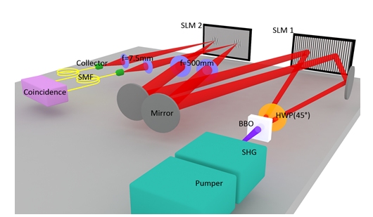 光的軌道角動量自由度由于其天然的高維屬性,自發現起就被廣泛應用于各類高維系統的構建中。在實驗中通過光的參量下轉換過程產生了軌道角動量光的最大糾纏態