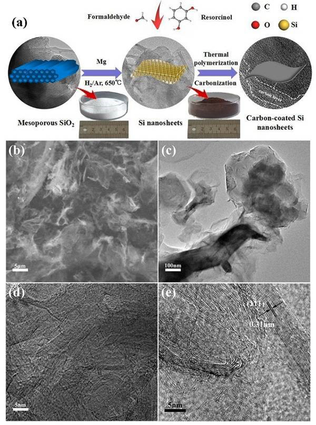 (a) 納米片合成示意圖;(b) Si納米片的SEM;(c) Si納米片的TEM;(d-e) Si納米片的HRTEM。