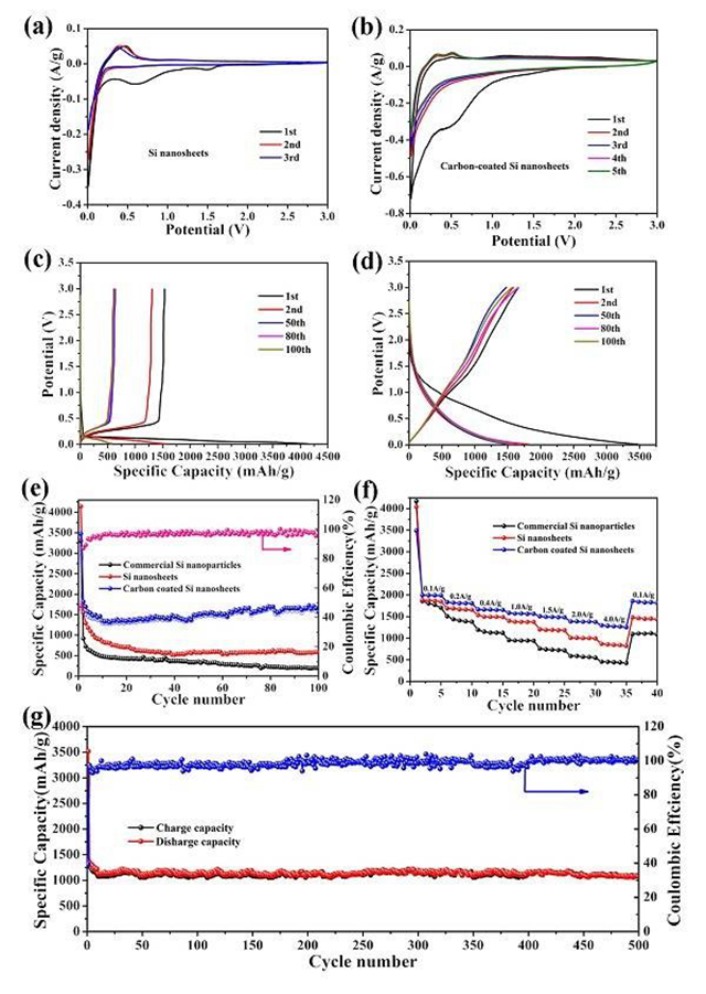 (a) Si納米片前三個循環(huán)的CV曲線;(b) Si/C納米片前三個循環(huán)的CV曲線;(c) Si納米片的恒電流充放電曲線;(d) Si/C納米片的恒電流充放電曲線;(e) 400 mAg-1下商 業(yè)硅顆粒、純硅納米片及Si/C納米片的循環(huán)穩(wěn)定性比較;(f) 不同電流密度下商業(yè)硅顆粒、純硅納米片及Si/C納米片的倍率性能比較;(g) 4Ag-1下Si/C納米片的循環(huán)性能。