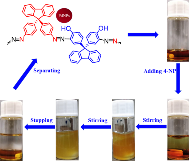 廢水中對硝基苯酚的去除和轉(zhuǎn)化與人類的健康信息相關(guān),是可持續(xù)發(fā)展研究的重要內(nèi)容,也是檢驗催化劑性能的經(jīng)典反應(yīng)。通過“異相反應(yīng)均相化”的策略,該工作利用可溶性的有機多孔聚合物Azo-POP-7負載貴金屬Pd,得到了分布均一,尺寸極小的納米Pd顆粒(< 2nm)。同時,負載金屬Pd后的Pd@Azo-POP-7仍能保持優(yōu)異的溶解性,并用于有機/水兩相中催化對硝基苯酚的還原。