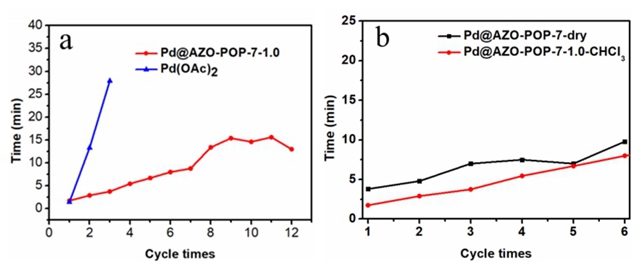 此外,Pd@Azo-POP-7具有優(yōu)異的循環(huán)催化性能。在相同的反應(yīng)條件下,以醋酸Pd作為反應(yīng)的催化劑,只能進行3次循環(huán)催化。而以Pd@Azo-POP-7作為催化劑時,催化反應(yīng)可以進行12次以上,仍然保持很高的催化活性(圖4)。這主要歸功于Azo-POP-7的羥基偶氮官能團與金屬Pd間存在配位作用,很好地分散了Pd納米粒子,防止聚集,并防止其流失。該工作為制備可溶性有機多孔聚合物材料提供了新的思路,拓展了有機多孔聚合物在兩相催化中的應(yīng)用。