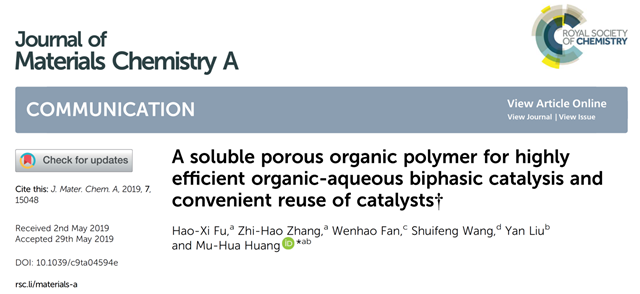 有機多孔聚合物(POPs)是一種新興的多孔材料,具有廣泛的應(yīng)用前景。北京理工大學材料學院的黃木華課題組長期以來關(guān)注功能性有機多孔聚合物的實用制備及應(yīng)用技術(shù)。該小組先后實現(xiàn)了Cu粉催化的Ullmann偶聯(lián)反應(yīng)制備硝基功能化的有機多孔材料NO2-PAF-1(Polym. Chem., 2016, 7, 770),利用NaBH4介導的還原偶聯(lián)反應(yīng),快速制備了偶氮鍵鏈接的有機多孔聚合物材料Azo-POP-1、Azo-POP-2和Azo-POP-3(J. Mater. Chem. A, 2018, 6, 5608)。該工作報道了第一例可溶性的Azo-POPs,并創(chuàng)新性地將可溶性的Azo-POPs用于有機/水兩相催化反應(yīng),取得了良好的催化效果和催化劑的循環(huán)使用性,為可持續(xù)發(fā)展提供了技術(shù)支持。該工作發(fā)表在《Journal of Materials Chemistry A》 (A Soluble Porous Organic Polymer for Highly Efficient Organic-Aqueous Biphasic Catalysis and Convenient Reuse of Catalysts, 2019. 7 (25): p. 15048-15053. DOI: 10.1039/C9TA04594E)(SCI頂級期刊,影響因子10.73)上。碩士研究生付浩熹為該論文的第一作者,黃木華特別研究員為通訊作者。該工作得到了國家自然科學基金(No. 21772013)、北京市自然科學基金(No. 2162039)以及中央高校基本科研業(yè)務(wù)費專項基金的大力資助。同時,該工作也得到了材料學院先進材料實驗中心的大力支持。