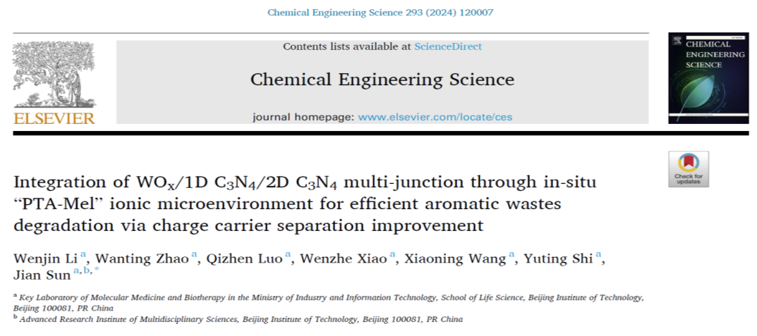 論文詳情:Wenjin Li, Wanting Zhao, Qizhen Luo, Wenzhe Xiao, Xiaoning Wang, Yu ting Shi, Jian Sun*, Integration of WOx/1D C3N4/2D C3N4 multi-junction through in-situ“PTA-Mel“ ionic microenvironment for efficient aromatic wastes degradation via charge carrier separation improvement. Chem. Eng. Sci., 2024, 293, 120007.