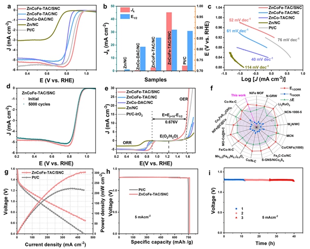 優化的ZnCoFe-TAC/SNC電子結構具有更好的OER和ORR性能。在堿性介質中,基于ZnCoFe-TAC/SNC催化的OER和ORR電位差(?E = EOER, j=""10" – EORR,1/2)僅有0.676 V,顯示出較好的雙功能催化活性。此外,基于ZnCoFe-TAC/SNC組裝的鋅空電池的峰值功率密度為304 mW cm-2和比容量為760 mAh g-1。
