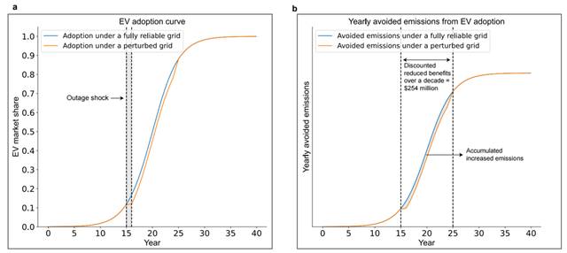 研究發現,電力系統穩定性是制約交通領域電氣化的重要因素,電力供應中斷顯著影響了新能源汽車的推廣。具體的,電力供應中斷導致純電動汽車和插電式混動動力汽車的銷量(滯后1到2期)出現了明顯的下降(見表1)。在此基礎上,該研究進一步預測了由于電力供應中斷引起的未來新能源汽車市場份額變動及其對碳減排效益的潛在影響(見圖1)。