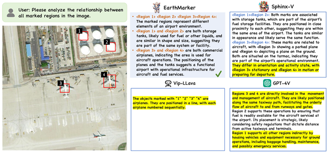 EarthMarker可完成復(fù)雜視覺(jué)推理任務(wù),尤其在遙感目標(biāo)關(guān)系分析任務(wù)中性能超越GPT-4V。如圖1所示,EarthMarker展示出驚人的分析能力:其首先總結(jié)了視覺(jué)提示所標(biāo)識(shí)區(qū)域分別為機(jī)場(chǎng)環(huán)境中的不同要素, 接著對(duì)相同類別的區(qū)域進(jìn)行了聚類分析,并推理出這些標(biāo)注區(qū)域在機(jī)場(chǎng)環(huán)境中的不同功能。