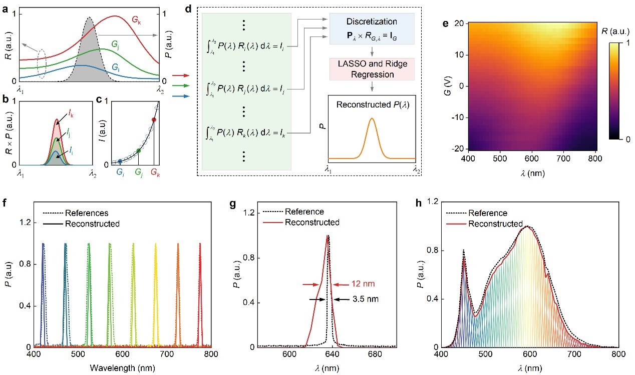 圖1. 范德華光譜儀的設計原理及光譜重構功能展示