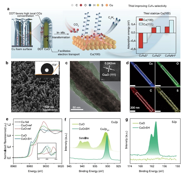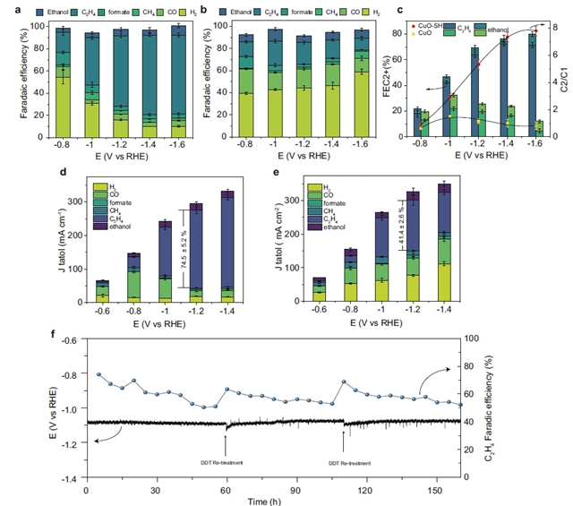 為了解決這個問題,本研究通過表面改性的銅基催化劑實現了對乙烯的高選擇性轉化,他們開發了有機分子十二烷基硫醇(DDT)修飾的CuO分層納米結構電極實現了 CO2RR 的高選擇性,尤其是對乙烯的選擇性。C2H4 產物的法拉第效率 (FE) 高達 80%,與未經 DDT處理的電極相比提高了四倍多。結果表明,DDT有助于二氧化碳在催化劑表面的傳輸,并增強了CO在催化劑表面的覆蓋度。此外,研究還發現,DDT能夠穩定Cu(100)晶面,從而促進了C-C偶聯反應。密度泛函理論(DFT)計算進一步揭示了DDT可以降低CO和CHO之間C-C偶聯的活化能壘。