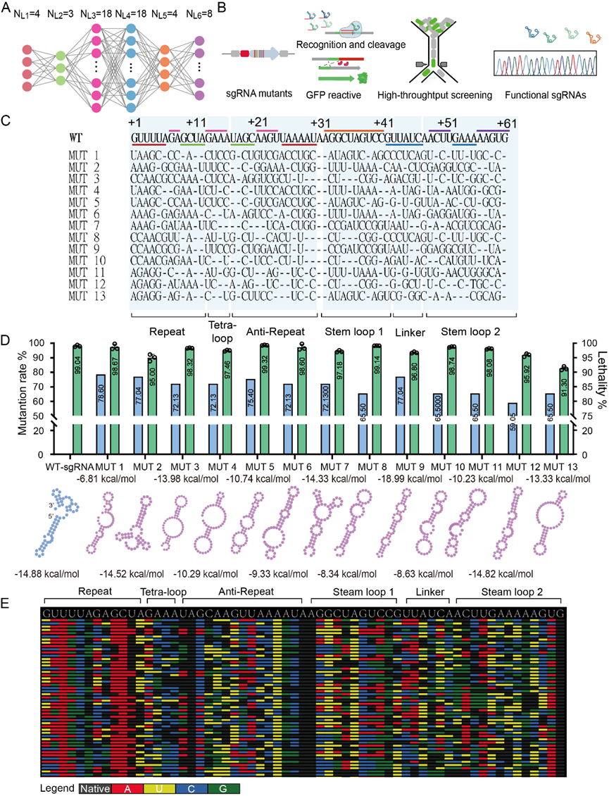 之后我們根據(jù)sgRNA的結(jié)構(gòu),分區(qū)進(jìn)行突變庫(kù)構(gòu)建與篩選,將篩選得到的6個(gè)單區(qū)有活性的突變序列進(jìn)行隨機(jī)組合。利用該篩選系統(tǒng),我們得到了具有突變率超過(guò)50%的sgRNA突變體序列,并且這些sgRNA突變體與Cas9蛋白形成復(fù)合體后仍能夠在細(xì)胞內(nèi)保持與野生型水平相當(dāng)?shù)暮怂崦富钚浴Mㄟ^(guò)結(jié)構(gòu)模擬,我們發(fā)現(xiàn)這些sgRNA突變體由于具有高的序列突變率而失去了公認(rèn)的典型二級(jí)結(jié)構(gòu),這表明Cas9蛋白與sgRNA突變體可以相互適應(yīng)并進(jìn)行結(jié)構(gòu)校正。進(jìn)一步,我們將高通量篩選系統(tǒng)與高通量測(cè)序技術(shù)相結(jié)合。通過(guò)高通量測(cè)序,最終得到了大量sgRNA突變體序列,并且這些突變體序列均與野生型sgRNA序列有巨大差異 (圖三)。