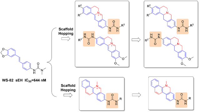 近日,北京理工大學(xué)化學(xué)與化工學(xué)院梁建華教授課題組在靶向sEH的抗炎天然藥物開發(fā)領(lǐng)域取得重要進(jìn)展,相關(guān)成果發(fā)表在藥物化學(xué)國際頂級期刊Journal of Medicinal Chemistry 。可溶性環(huán)氧化物水解酶(sEH)是一個很有前途的炎癥治療靶點,但天然產(chǎn)物骨架在這方面并未得到應(yīng)有的重視和深入研究,這導(dǎo)致了目前的化合物存在藥物吸收差代謝快、血液濃度低等缺陷。我們的研究通過二苯乙烯的戰(zhàn)略性骨架躍遷,在雙側(cè)或者單側(cè)進(jìn)行了構(gòu)象限制的環(huán)合重新設(shè)計了天然產(chǎn)物小檗堿和血根堿,實現(xiàn)了全合成制備氨基小檗堿等目標(biāo)化合物,創(chuàng)造出具有強(qiáng)效體內(nèi)療效的新型sEH抑制劑。北京理工大學(xué)梁建華教授、于明加預(yù)聘助理教授,琶洲實驗室朱心紅教授和北京化工大學(xué)馮越教授為本文共同通訊作者,北京理工大學(xué)為第一通訊單位。