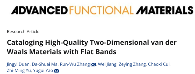 該工作得到國家自然科學基金委、科技部、北京理工大學青年教師學術啟動計劃等單位的支持。北京理工大學物理學院博士生段璟奕、馬大帥博士(2021屆博士畢業生,現供職于重慶大學)為該工作的共同第一作者,張閏午副教授、姚裕貴教授為共同通訊作者。另外,北京理工大學余智明教授、蔣偉教授、張澤英副教授(2019屆博士畢業生,現供職于北京化工大學)、博士生崔朝喜也對此工作做出了貢獻。相關結果發表于國際頂級期刊Advanced Functional Materials (IF: 19.0):Jingyi Duan,? Da-Shuai Ma,? Run-Wu Zhang*, Wei Jiang, Zeying Zhang, Chaoxi Cui, Zhi-Ming Yu, and Yugui Yao*; “Cataloging High-Quality Two-Dimensional van der Waals Materials with Flat Bands”, Advanced Functional Materials, 2313067 (2024). (?為共同一作;*為共同通訊作者。)