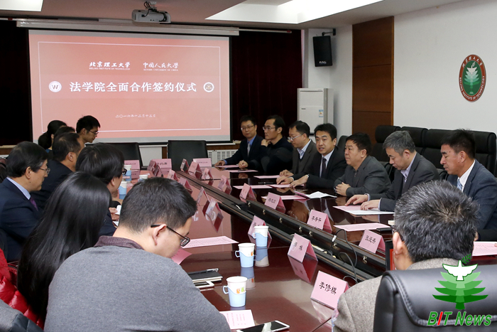 2016年12月13日下午,為落實北京理工大學與中國人民大學簽署校際戰略合作協議,北理工法學院與中國人民大學法學院在科學研究、人才培養、學科建設方面展開深度合作,簽署了《北京理工大學法學院與中國人民大學法學院合作協議》。簽約儀式由北理工法學院黨委書記楊海主持。人民大學常務副校長王利明教授、法學院院長韓大元教授及法學院班子成員,北理工常務副校長楊賓教授、紀委書記楊志宏教授、法學院院長李壽平、黨委書記楊海及法學院班子成員共同見證了簽字儀式,雙方還就合作協議的落實及具體合作事項進行了深入探討。