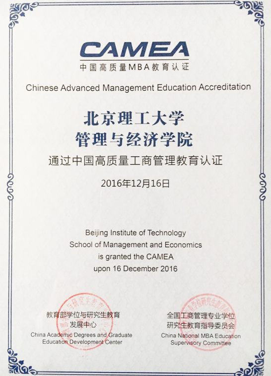 近日,在教育部學位與研究生教育發展中心和全國工商管理專業學位研究生教育指導委員主辦的全國第二屆中國高質量MBA教育認證培訓會議上,北理工管理與經濟學院獲頒中國高質量MBA教育認證(CAMEA認證)證書,是我國第13所獲得該認證的單位,也是管理與經濟學院繼通過AMBA、EQUIS等國際認證后,獲得的又一項重要認證。