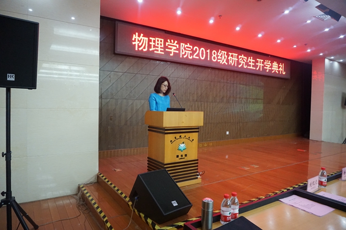 9月4日,物理學院2018級研究生開學典禮在圖書館報告廳舉行。物理學院黨委書記姜艷、執行院長姚裕貴、副院長蘇文勇、導師代表邢艷霞出席典禮,輔導員、教學干事以及2018級全體研究生參加典禮。開學典禮由學院副書記、副院長王晶晶主持。