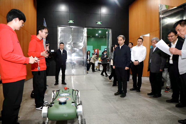 機電學院博士生顏軻領誦科創倡議,展現北理工青年科創報國的志向情懷。機電學院和機械與車輛學院的學生科創團隊分別展示了自主研制的微小型仿生機器鼠和高機動重載輪腿機器人。