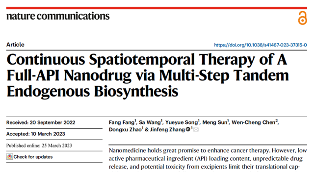 2023年3月, 張金鳳課題組提出的一種名為全活性納米藥物(Full-API nanodrug, FAND)的概念,作為一種可用于癌癥治療的新型高效低毒的納米藥物,引起了極大關注。相關成果以獨立通訊作者發表在國際頂級學術期刊《Nature Communications》上(Nat. Commun., 2023, 14, 1660)。