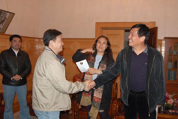 我校黨委副書記侯光明與大學生戲劇節評委會成員在交流。