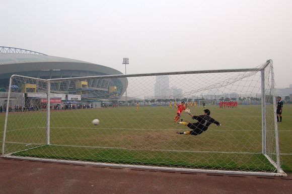 點球決戰異常殘酷,前五輪罰球,雙方各射失一球,開始進入單輪罰球決勝后,雙方又都各進一球。罰球進行到了第七輪時,對方隊員似乎想聲東擊西,但在巨大的壓力之下動作變形,竟然將球打飛,只要我方再進一球,就將創造歷史。