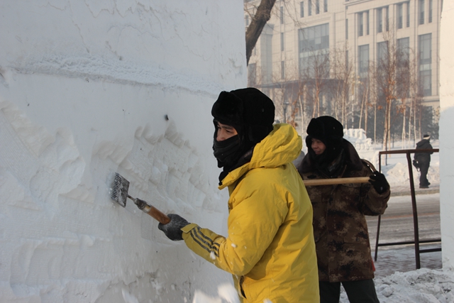 第三天,任務(wù)依然很繁重,比賽進(jìn)入了白熱化階段,看著其他代表隊(duì)的作品也逐漸成形,同學(xué)們的心里既緊張又激動(dòng)。在雕刻過程中,周谷川隊(duì)長看到女生坐在雪上進(jìn)行雕刻時(shí),毫不猶豫地就把自己的帽子摘了下來,讓女生們坐在帽子上工作。遇到一些需要精雕細(xì)琢的部位,李雨璇和蔣亦希兩位女生常常整個(gè)身體趴在冰上工作,整個(gè)雕刻過程她們始終保持著一絲不茍、精益求精的態(tài)度,絲毫沒有叫冷叫苦。事后兩個(gè)女生甚至自我調(diào)侃道:“我們都是女漢子中的‘女漢子’啊!”