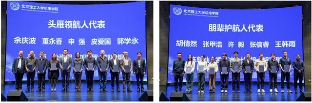 機(jī)電學(xué)院院長(zhǎng)王海福院士、特立書(shū)院常務(wù)副院長(zhǎng)王軍政為頭雁領(lǐng)航人代表頒發(fā)聘書(shū),精工書(shū)院副院長(zhǎng)陳浩、機(jī)電學(xué)院副院長(zhǎng)黃廣炎為朋輩護(hù)航人代表頒發(fā)聘書(shū)。