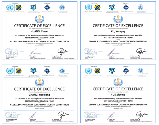 此次競賽后,競賽組委會挑選優秀學生代表組成“Global Youth Sustainable Supply Chain Advocacy”大使團,與聯合國相關機構及國際貨代協會總部等對接,以學生大使的身份,宣傳可持續供應鏈和聯合國可持續發展目標(UN SDGs),我校黃郁微同學入選該學生大使團。