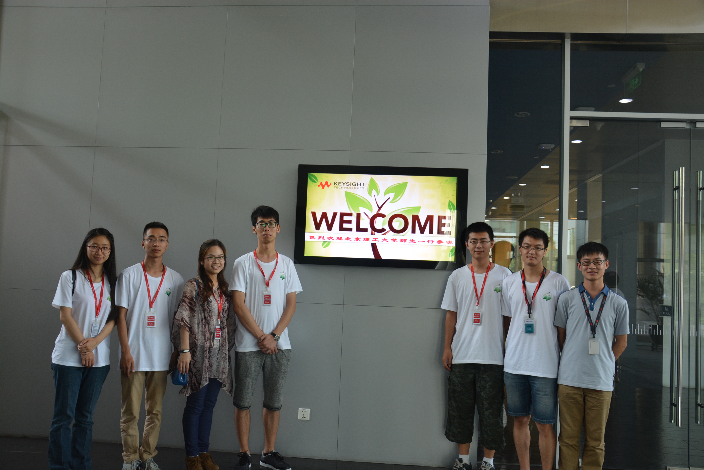 一到是德科技公司,實踐隊員們就受到了大中華區人力資源部冷冰的熱情接待。在公司門口,電子屏幕上出現“歡迎北理工師生一行參觀”的海報,體現出了公司對本次活動的重視與是德人注重細節的辦公風格。