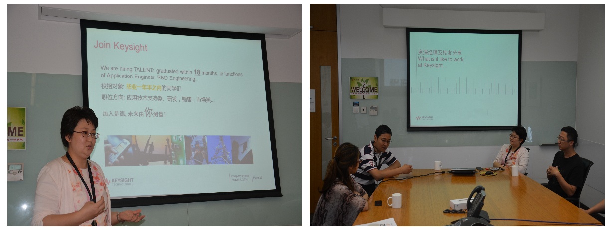 最后,公司的資深經理和校友們與同學們展開了親切交流。是德科技實驗室中國區研發經理孔紅偉向大家講解了公司的科研模式,與同學們分析了在公司里搞科研與在學校的區別。2006屆博士校友王錚跟大家一起分享了自己的工作經歷,并給予同學們不少中肯的建議。2013屆碩士校友張誠跟同學們介紹了自己選擇是德科技的理由以及在銷售部的工作情況。2015屆碩士程亞冰向同學們講述了自己經過重重選拔加入是德科技的過程。關于同學們關心的企業面試中需要注意的問題,經理們告訴大家,不同部門及不同崗位有不同的就職要求,面試側重點會有所區別。例如,研發部門就會非常注重面試者的理論知識和過往的項目經驗;而市場和銷售部門除了看重面試者對專業知識的了解和掌握,同時還強調語言表達能力和解決問題的能力。前輩們中肯的職業規劃建議讓大家受益匪淺。