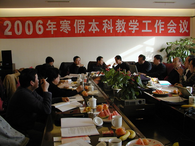 2006年2月15—17日,教務處組織召開了為期三天的寒假教學工作會議。常務副校長李志祥、副校長孫逢春、教務處處長、副處長及各科科長、各學院教學院長以及人事處、學生工作處、實驗設備處、圖書館等職能部門領導參加了會議。會議由教務處處長龐思勤主持。會議議題主要包括本科教學計劃的修訂、全面選課制和提高教學質量、本科教學評估等工作。會議針對以上議題進行了認真熱烈的討論,對新學期的工作進行了部署。會議期間,學校黨委副書記侯光明還專門到會場看望了大家。