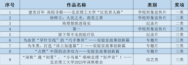 自活動啟動來,北京理工大學電視臺圍繞學校中心工作,積極征集、整理和報送符合要求的我校優秀影視作品。此次,我校參評作品《建黨百年 高校尋根——北京理工大學“紅色育人路”》《徐特立:人民之光,我黨之榮》《第一》分別獲評學校形象宣傳片類一類、二類、三類作品獎,《將理想照進現實》《留下帶不走的醫療隊》分別獲評紀錄片二類、三類作品獎,“聆聽北理”之《實驗室故事創新篇》系列作品獲評專題片三類作品獎。此外,由黨委宣傳部大學生記者團制作的《“深秋”遇“初夏”,“小鳥巢”唱響北理“好聲音”!——北京理工大學2023年深秋歌會》獲評綜藝類三類作品獎。